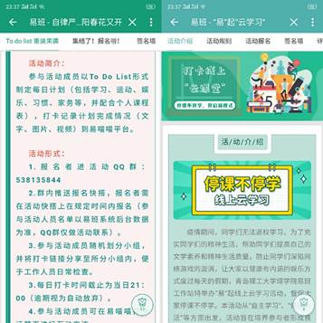 特殊时期,分站响应“停课不停学”号召,带领同学们积极投入到学习生活中去,丰富学生居家生活,展现当代大学生的青春活力,开展“云学习”、“云自律”打卡活动,为全校同学提供云端自律打卡平台,倡议学生合理安排假期、做好学习规划,近百名同学根据自己的学习和兴趣成功完成了#自律严以待,阳春花又开#打卡任务,活动以高参与度、高完成度圆满结束,展现了理工学子积极健康的生活状态,培养了学生积极学习、独立自律的品质,推进了校园文明自律风气建设。