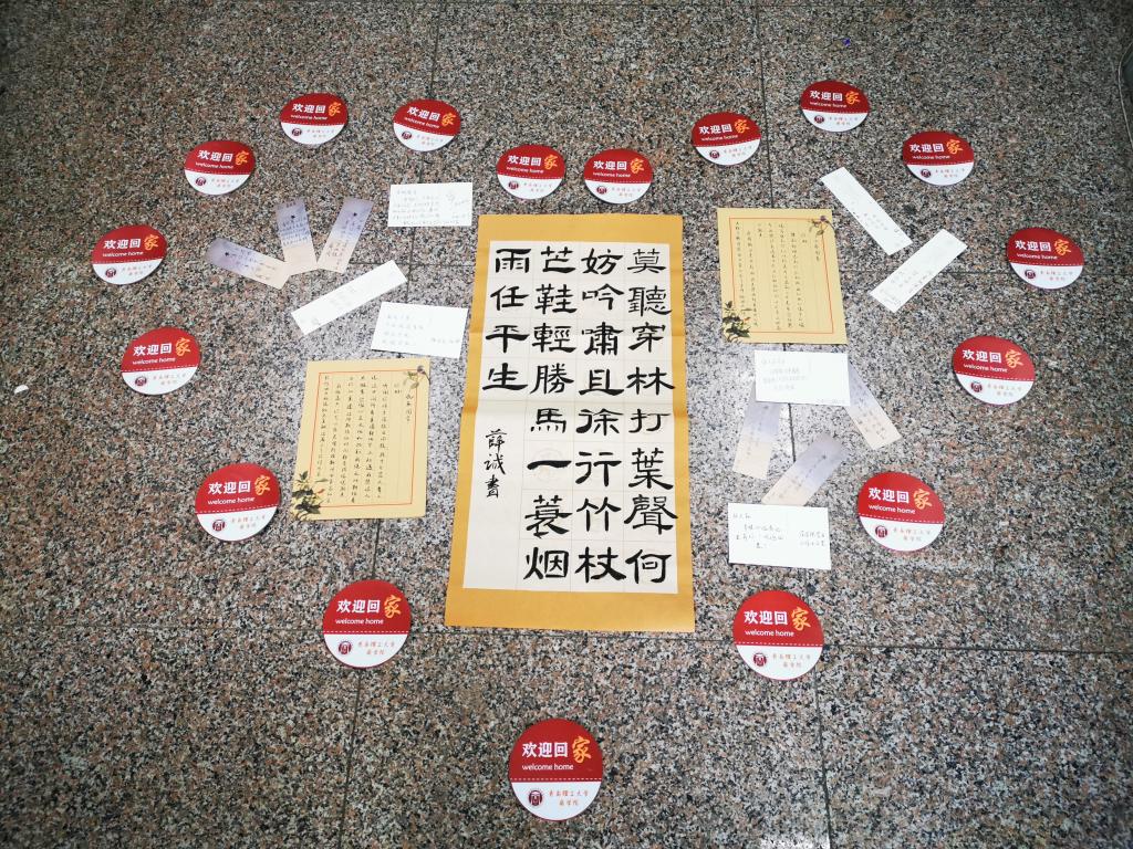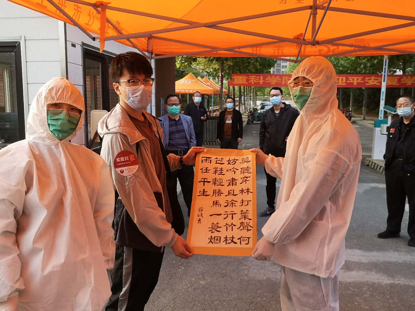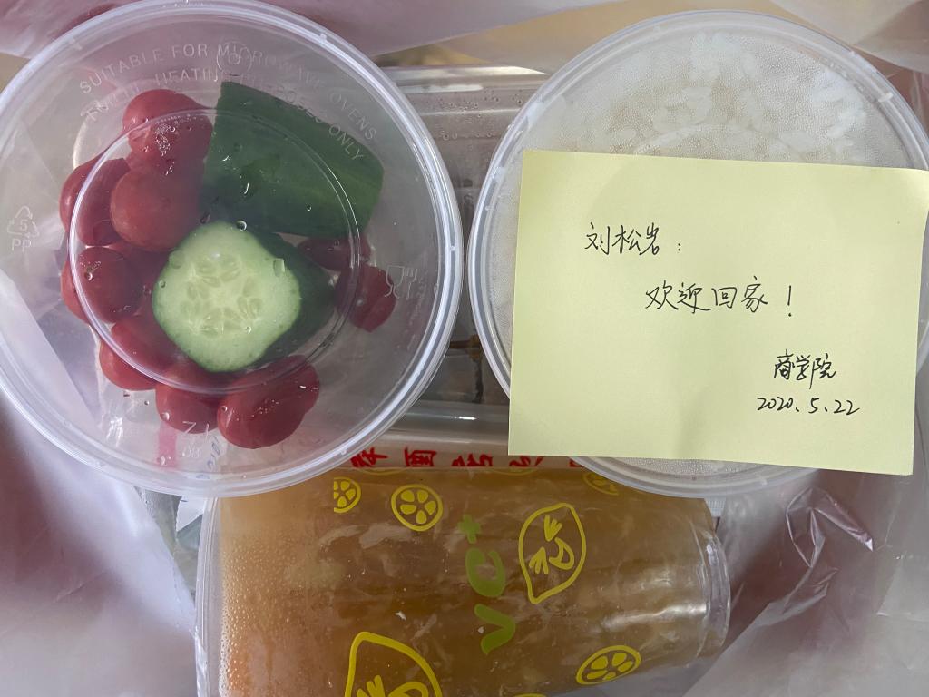 5月22日下午五点半,商学院首位返校学生刘松岩到达学校,在校门口迎接他的是早已等候多时的商学院党总支书记王粲,党总支副书记董兰国,辅导员孙照和薛诚。辅导员孙照为刘松岩手臂贴上了“欢迎回家”小臂章,“竹杖芒鞋轻胜马”,书法《定风波》既是商学院学生工作办公室送给第一位返校同学刘松岩的小礼物,也表达了商学院对于顺利完成首轮学生返校工作的信心。而当刘松岩到达宿舍,一份营养晚餐已放在他宿舍门口的小凳上,辅导员杨洪敏还亲手为刘松岩洗了水果,希望能让他尽快从旅途的疲惫中恢复过来。收到礼物的刘松岩感动的热泪盈眶,说:“谢谢老师,你们真是太温暖了!”