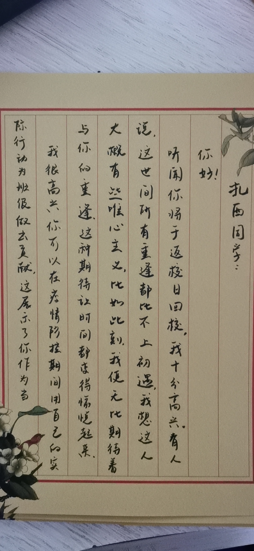 此外,商学院也为首轮返校的其他学生准备了温馨礼物。“无比期待着与你的重逢”是财管161班班主任写给藏族学生扎西的信件。毕业生辅导员孙照,刘奕,姜圣天以及学工办每一位老师都为返校学生写了书签和明信片,表达着老师对学生们的思念和祝福。