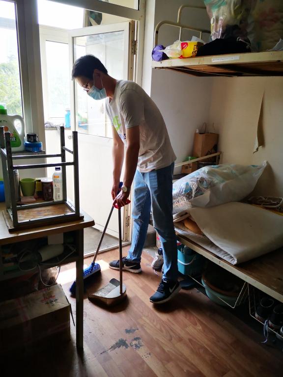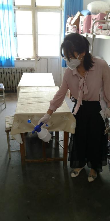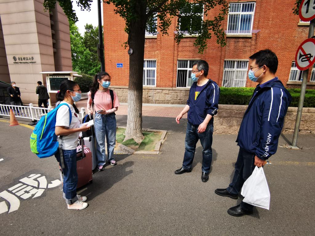 在学生返校前,辅导员王鹏飞、杨霈宣、王明慧、郭轶群前往学生宿舍,对返校学生宿舍进行通风、消毒并帮他们晾晒被褥。辅导员们提前在校门口等待学生,给他们带去家人的温暖。