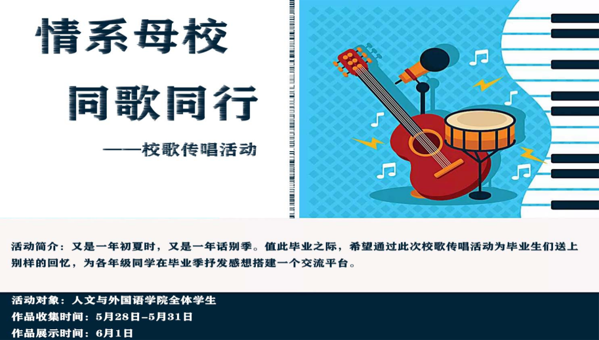 为营造温馨和谐的校园毕业氛围,加强对毕业生的人文关怀,传承丰富积极的校园文化,5月28日至6月1日,人文与外国语学院易班分站面向全院学生,举办毕业生文明教育主题活动之致青春系列活动——“情系母校,同歌同行”校歌传唱活动,活动约有近百人参加。