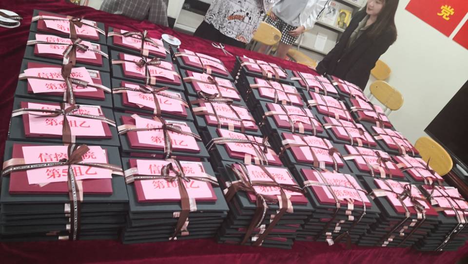 毕业典礼的前一天晚上,为了保证毕业证和学位证能够准确无误的发放到每一位同学的手中,学院全体辅导员再次为毕业生捆绑双证,忙到凌晨。小小的蝴蝶结承载着老师们的深深祝福。