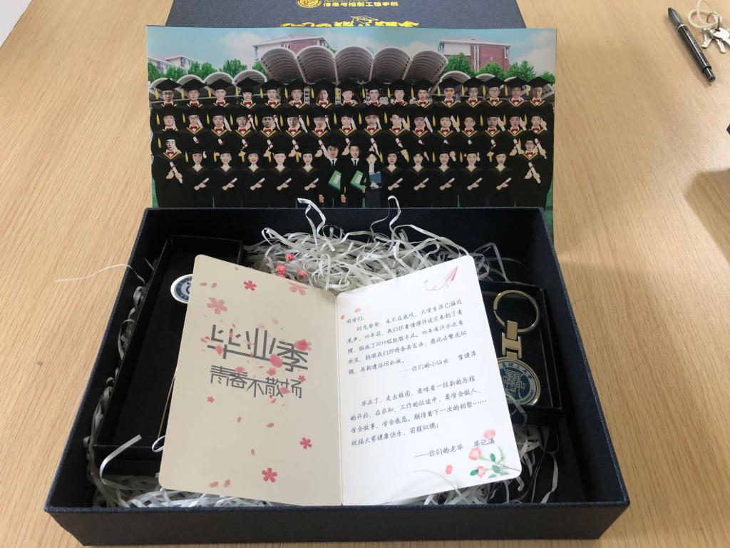 为了给2020届毕业生留下一段难忘的毕业记忆,学院提前筹划、用心制作了毕业礼物,带有学校标识的钥匙扣、带有学院标识的书签、辅导员寄语、班级云毕业照和学院毕业MV。希望2020届毕业生能够带着母校和学院的祝福,展翅高飞,大展宏图。