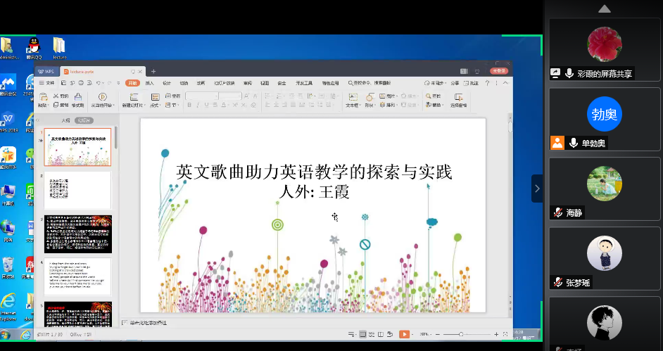 6月17日下午,人文与外国语学院“新论语”讲坛第72讲顺利进行。本次讲座借助腾讯会议平台以线上形式开展,由大学英语教研室副教授王霞主讲,主题为“英文歌曲助力英语教学的探索与实践”。