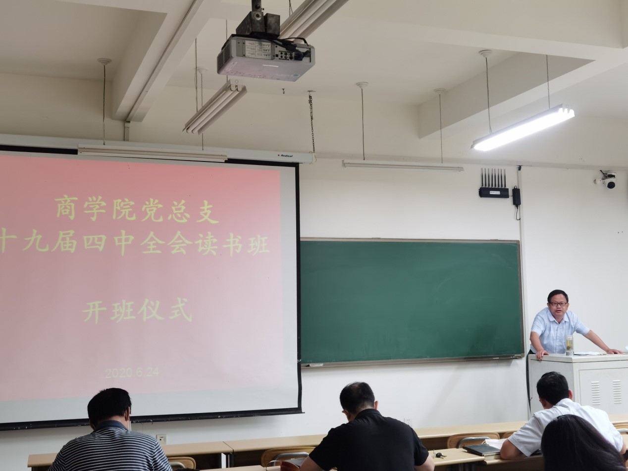 6月24日上午,商学院党总支十九届四中全会读书班开班仪式在嘉陵江路校区主教学楼B326举行,党总支书记王粲同志主持并作学习动员讲话,学院全体处科级干部参会。