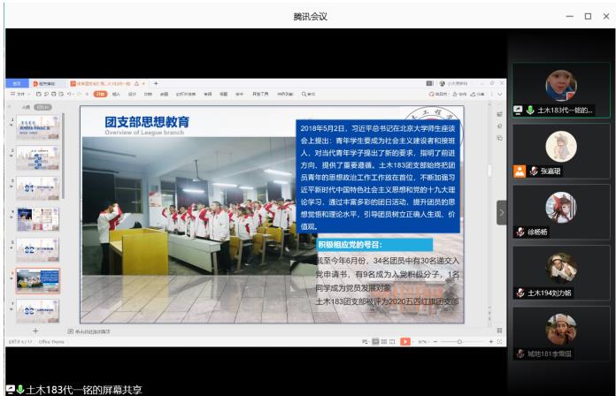 参选的各班团支书们结合ppt展示,以生动、鲜活的事例向评委们讲述了各团支部的精彩故事与所得所感。城地181团支书李雪琪通过一段视频展示了城地181团支部与机械183团支部跨校区组织的“新家园,共成长”团日活动;土木183团支书代一铭通过形势多样的图片展示了团支部取得的各类奖项,土木191团支书吴毓倩详细介绍了所在团支部的班级文化建设以及学生干部团队建设;土木194团支书刘力铭分享了团支部“每日一说”“轮值班助”“趣味晨跑”等多项特色团建活动;土木196团支书孔子航详细展示了寒假疫情期间团支部先进个人事迹及线上工作开展情况……评委老师就团支部的组织建设、思想建设、学生发展情况、青年大学习团课落实情况等多方面、全方位对参选人员进行打分考察。