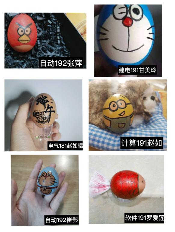 适逢端午,学校为每位在校生准备了两个粽子和一个鸡蛋,借助学校充满幸福感的安排,学院易班工作分站举办即兴创作活动,鼓励同学们绘画创作属于自己的节日“彩蛋”,活动要求同学们以自主创作的方式,将自己作品的拍摄照片配上自己想要表达的文字发送至易班信控学院微社区话题,共同表达节日美好祝福。可爱的小黄人、精致的机器猫、火红的锦鲤……每个作品都饱含着同学们的美好祝愿和浓浓的童年趣味。自动192张萍配文:“我喜欢用颜料描绘下自己的喜怒哀乐,而在鸡蛋上画画是我从来没有体验过的。”计算191班的赵如,她的绘画信手拈来,拿起画笔的她仿佛如鱼得水,她提到:“小时候可喜欢拿着画笔到处写写画画了,看到鸡蛋我便想到了小黄人,鸡蛋这圆滚滚的身子,画上大大的眼睛,活像颗黄色的胶囊。”简简单单的涂鸦和文字,画上几笔好看的线条,写上几句自己的真情实感,鸡蛋也就马上变得绚丽多彩、生动鲜活了起来。