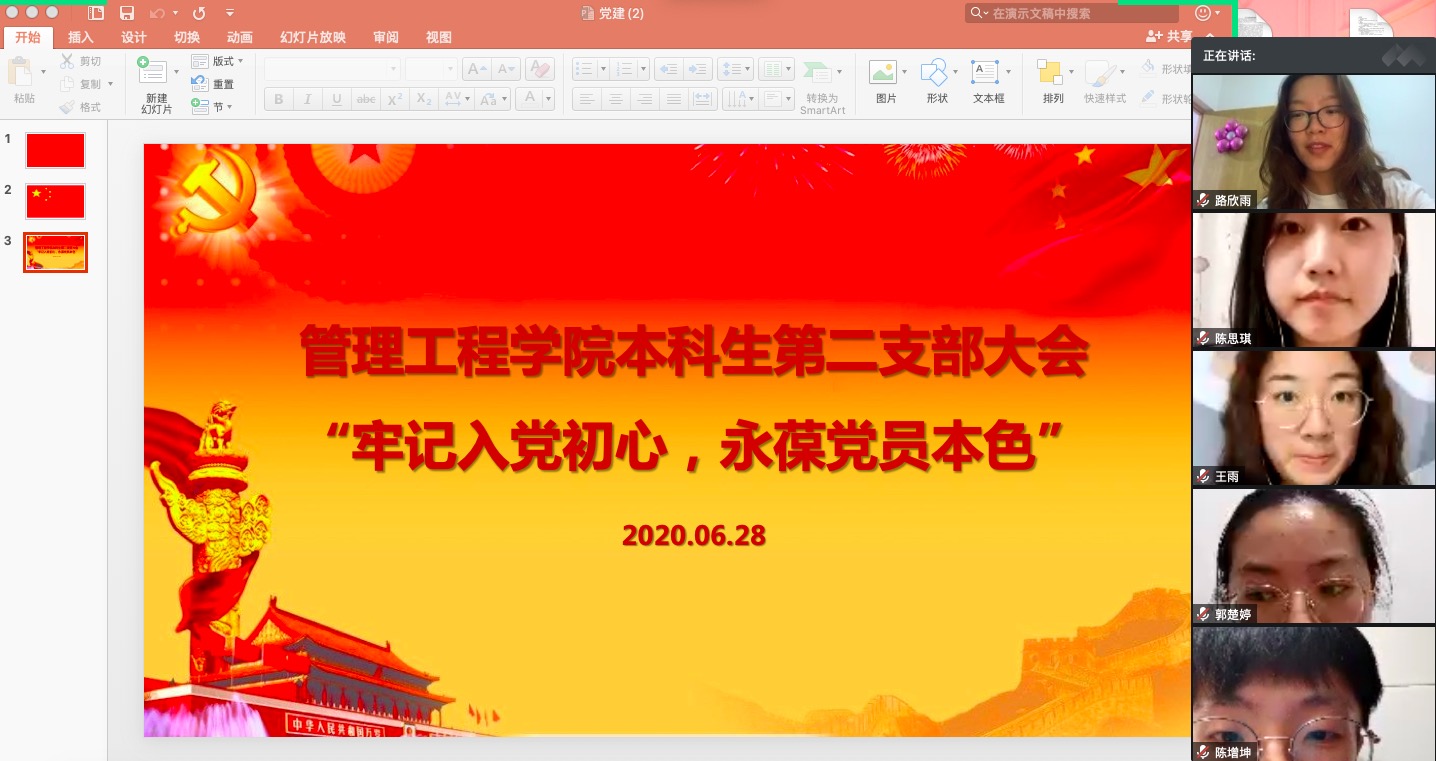 “不忘初心、牢记使命”是党的建设的永恒课题和全体党员的终身课题,为号召支部全体学生党员牢记初心和使命、永葆党的先进性和纯洁性,6月28日,管理工程学院本科生第二党支部召开线上会议,以“牢记入党初心,永葆党员本色”为主题进行党课学习,本次会议由支部书记邹佳欣主持,参会人员为管理工程学院本科生第二党支部全体党员。