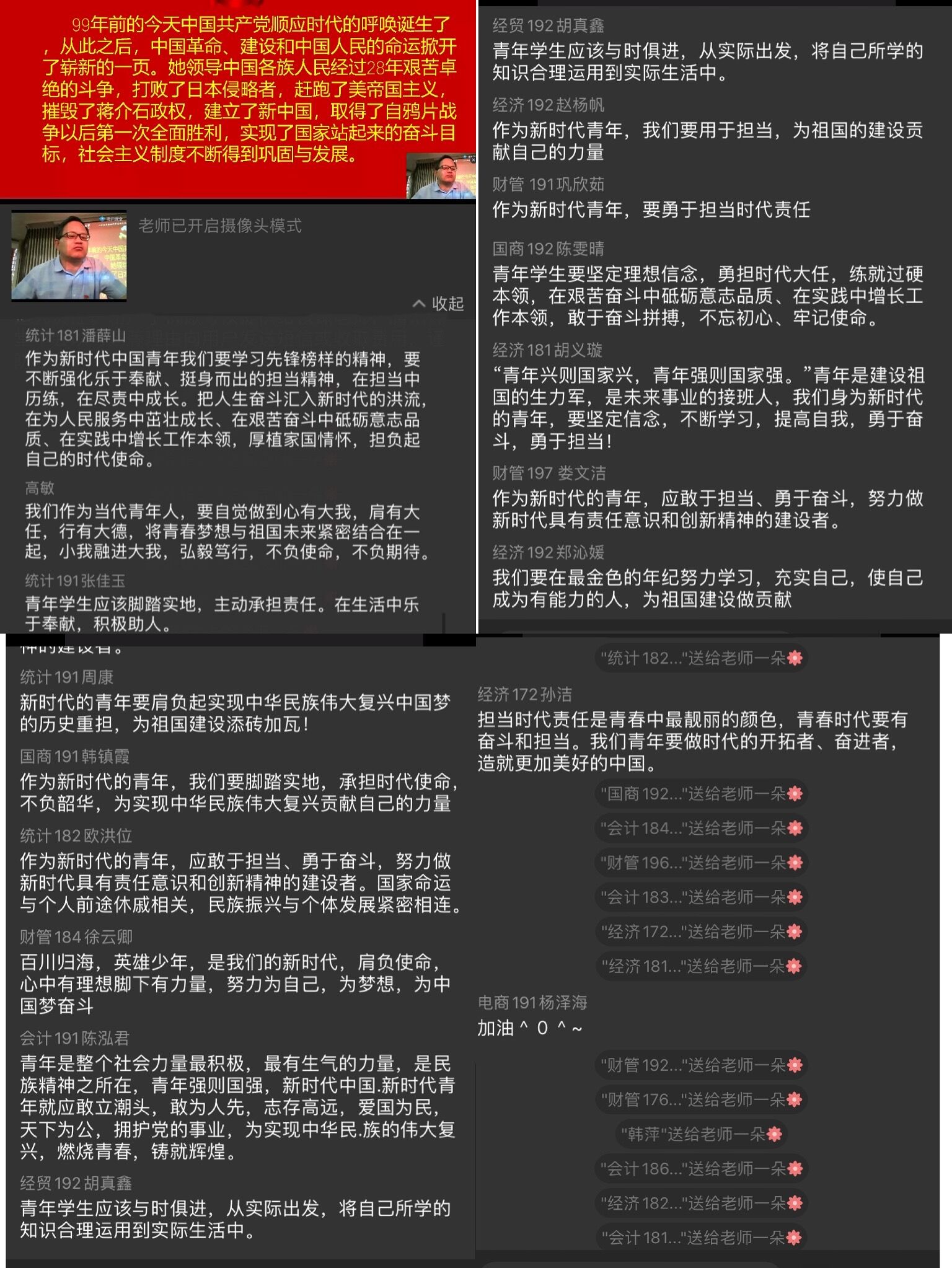 经济181班长胡义璇说:“青年是建设祖国的生力军,是未来事业的接班人,身为新时代青年,要坚定信念,不断学习,勇于奋斗,勇于担当!”统计181班长潘薛山谈到:“新时代中国青年要学习先锋榜样的精神,要不断强化乐于奉献、挺身而出的担当精神,在担当中历练,在尽责中成长。厚植家国情怀,负担起时代使命。”国商192班团支部书记陈雯晴也有自己的感悟:“青年学生要在艰苦奋斗中砥砺意志品质,在实践中增长工作本领,敢于奋斗拼搏,不忘初心、牢记使命。”
