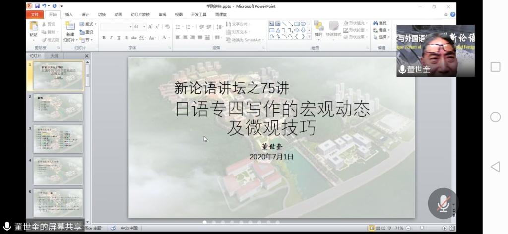 7月1日下午14时,人文与外国语学院“新论语”讲坛第75讲顺利进行。本次讲座由日语专业教研室董世奎副教授主讲,主题是“日语专四写作的宏观动态及微观技巧”。讲座借助腾讯会议平台以线上形式开展,日语专业的师生参加了本次讲座。