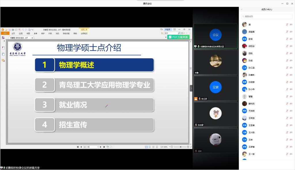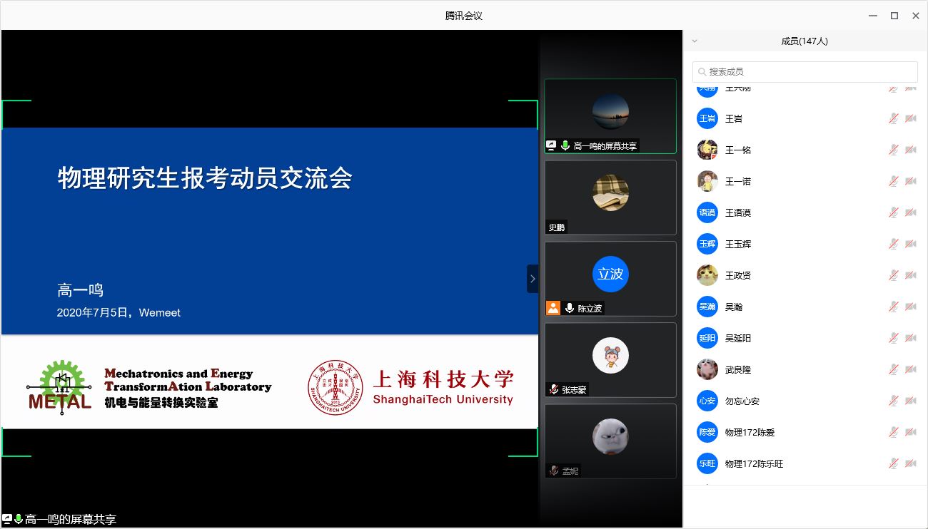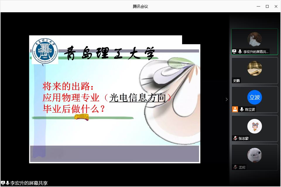 7月5日晚,专业物理教研室、公共物理教研室、实验物理教研室教师利用“腾讯会议”网络平台召开了“不忘初心,继续前行——追梦物理人-2021年研究生报考动员交流会”视频会议,对物理、数学等专业2021年将要报考研究生的学生进行了动员指导。教务处副处长马鸿洋教授、理学院院长助理邱田会副教授、专业物理教研室主任郑春红副教授、副主任史鹏老师、电子教研室主任王玉辉副教授出席会议,物理专业教师代表、研究生导师、优秀校友代表和物理、数学等专业学生近200人参加了本次视频会议。