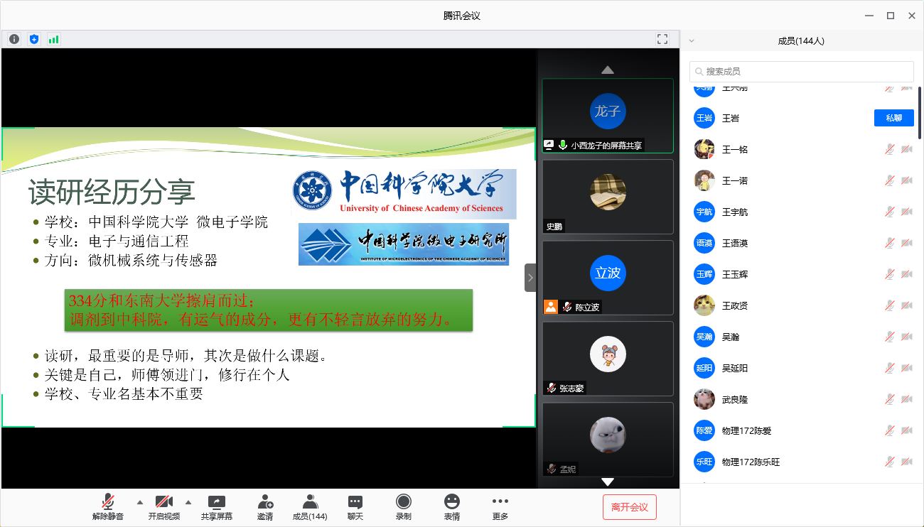 会议由物理专业陈立波副教授主持,陈立波首先介绍了本次会议的意义,对近几年物理专业毕业生考研情况做了简介。李宏升老师就考研必要性以及考研专业方向选择进行阐述。省优秀青年基金获得者初鹏程教授对365完美2021年物理一级硕士点招生(包括数学物理方向)进行简介。本次网络会议特别邀请了物理10级孟祥帅博士(现为西安交通大学讲师)、物理10级靖旭阳博士(现为西安电子科技大学讲师)、物理11级孙西龙(现为南京某军工研究所工程师)、物理14级高一鸣(上海科技大学硕博连读)等优秀校友。他们分别从研究生专业方向的选择、研究生考试准备、研究生期间学习出国等方面给同学们介绍了自己的成功经验。随后17级物理和数学专业的学生就自己关心的考研问题与物理专业教师和优秀学长进行了讨论交流。邱田会代表硕士导师们做了总结发言,对演讲的老师和同学表示感谢,鼓励17级学生明确目标,做好备考准备。马鸿洋教授最后总结,首先肯定了物理学科在学生考研工作上取得的成绩,勉励物理、数学专业学生一定珍惜大好时光努力学习,教导同学们继续扎实做好研究生考试的备考与复试科目的学习,只争朝夕、不负韶华,力争好的成绩。