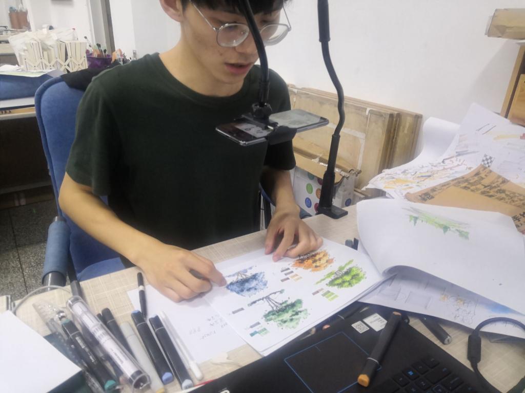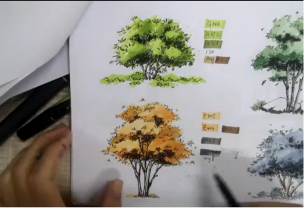 随后,魏庆展又系统讲解了关于马克笔绘图的系统知识。先是讲解了马克笔线条表达,平涂、扫笔、揉笔带来不同的表达效果。同时还分享了他总结的一些小技巧,大大解决了初学者画图容易出头,颜色不均等问题。此外,他还为同学们演示了包括墙体、植物、水等不同表达材质的方法,通过同类马克笔的不同深度,叠加形成富有层次感的较为真实的材质表达。