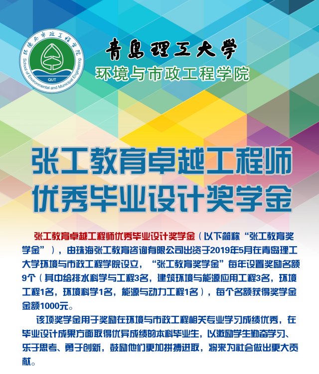 依据《张工教育卓越工程师优秀毕业设计奖学金评选办法》和学校奖学金评审相关规定,在坚持公开、公平、公正原则的基础上,2020年张工教育优秀毕业设计奖学金完成评选发放。环境与市政工程学院共有9名同学荣获张工教育优秀毕业设计奖学金,每人获得奖学金1000元。