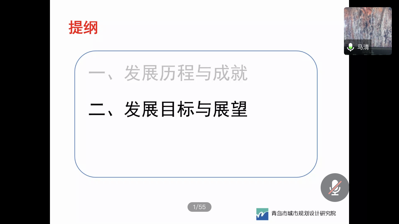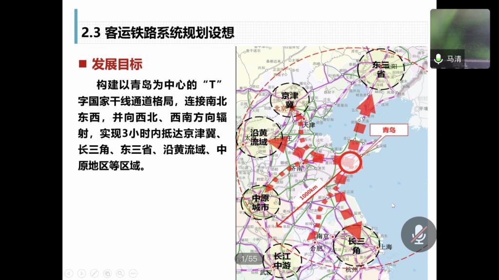 会议伊始,马清从青岛的历史沿革入手,对城市中海运、铁路、道路进行了基本介绍并表明了这三者对近代青岛的影响。随后,马清阐述了青岛老城区路网格局以及设计手法的街道特征,并向同学们展示了青岛市施行的都市计划,表明近代青岛市依托铁路海运港口的规划进行建设。马清进一步举例介绍了1970年以来东部新区的发展以及此后的胶州湾通道胶州湾隧道的建设。对1992年到2016年青岛城市轨道交通规划历程进行了详细的演示,表明城市轨道交通规划与不同发展时期的青岛市应与城市定位发展、战略相契合。此后,马清介绍了青岛近代以来的发展成就,阐明青岛特殊的地理位置特殊的关系对青岛市的影响。