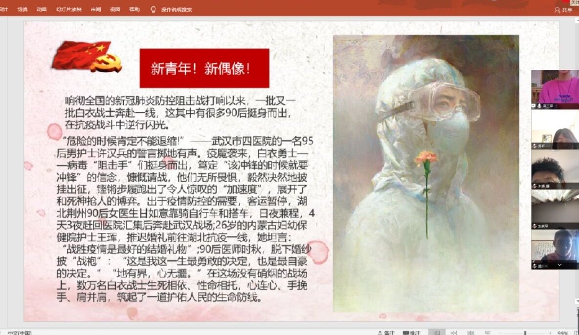 中美土木192团支部围绕疫情防控志愿服务工作、志愿服务工作中的先进个人事迹开展线上主题班会。团支书高玉萍向大家讲述土木171班侯文轩主动请缨参与防疫,承担小区防控新冠病毒宣传、来往签到、人员信息统计和消毒工作。自费购置消毒药品及工具,率先带头对所在小区3栋楼9个单元楼梯扶手、150个门把手和两个单元共24层电梯按键进行消毒。他积极响应学校号召,为“逆行者”保障后方,为一线医护人员子女提供线上辅导志愿服务,制定符合孩子实际的教学方案,每天和孩子的母亲进行交流,反馈孩子的学习情况,得到家长和孩子的一致好评,并荣获山东省大学生“青春贡献奖”。随后,同学们就先优学子的事迹开展学习,大家积极发言,分享自己所知道的疫情期间土木学子的光荣事迹。