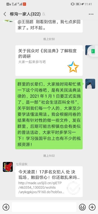 积极联系当地相关部门,组织协调好宣讲事宜,在村民群、社区群里普及民法典的常识。后期也将在学校、学院开展民法典的宣讲工作。