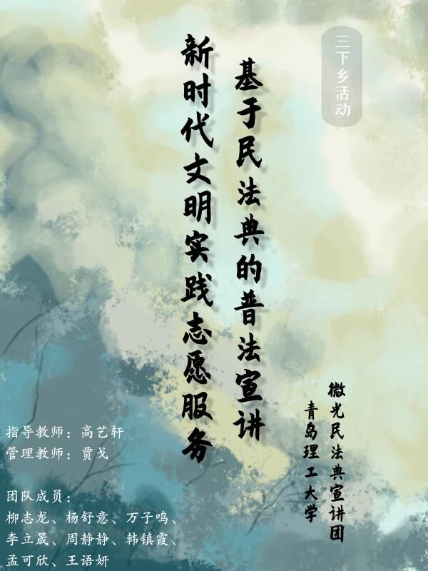 “微光”民法典宣讲团是一支“跨学院、跨专业”的三下乡队伍,配备指导老师高艺轩、管理老师贾戈。在队长的组织安排下,各成员选择以“线上+线下”和“返家乡”的形式,做好民法典的宣传工作。团队先后已撰写了9000余字的民法典明白纸,并制定了宣讲PPT及宣讲海报,利用新媒体资源扩大宣传影响力。