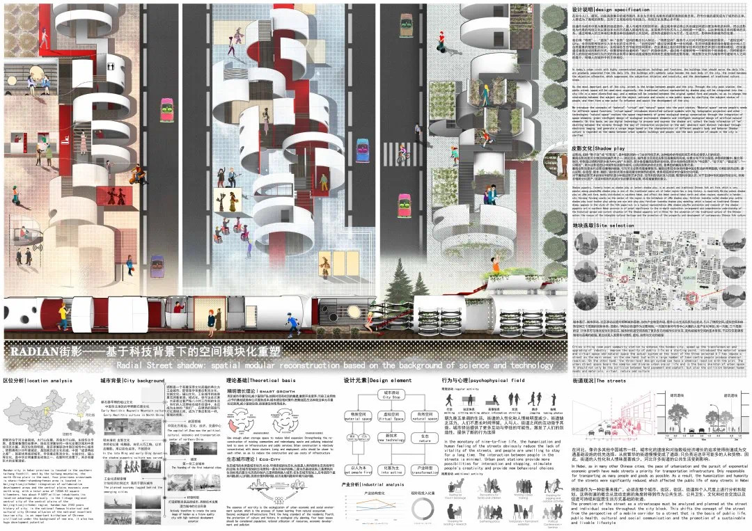 王文衡、成实、栾政山的“RADIAD街影设计”考虑到当今人口、建筑、功能高度集中,本该为日常生活服务的建筑逐渐脱离日常,符号化的建筑成为了城市的主体,人群成为了客观的剪影,压抑了主观能动性与创造力等现实问题。注重街道对于城市关联的桥梁作用,将“物质”、“虚拟”和“自然”空间的概念引入驿站。设计分为三大“空间”,“物质空间”服务于人们对不同空间功能的需求,“虚拟空间”以5G、全息投影等技术引入多元化的文化符号,“自然空间”通过空间要素一体化构建、生态环境要素的绿色智能设计和人工自然要素的智慧生态设计,实现绿色生态节能的空间需求。设计还通过墙面互动投影电子成像等技术与皮影结合,将皮影文化作为城市符号建筑与人之间的媒介,明确人在城市中的主体地位。