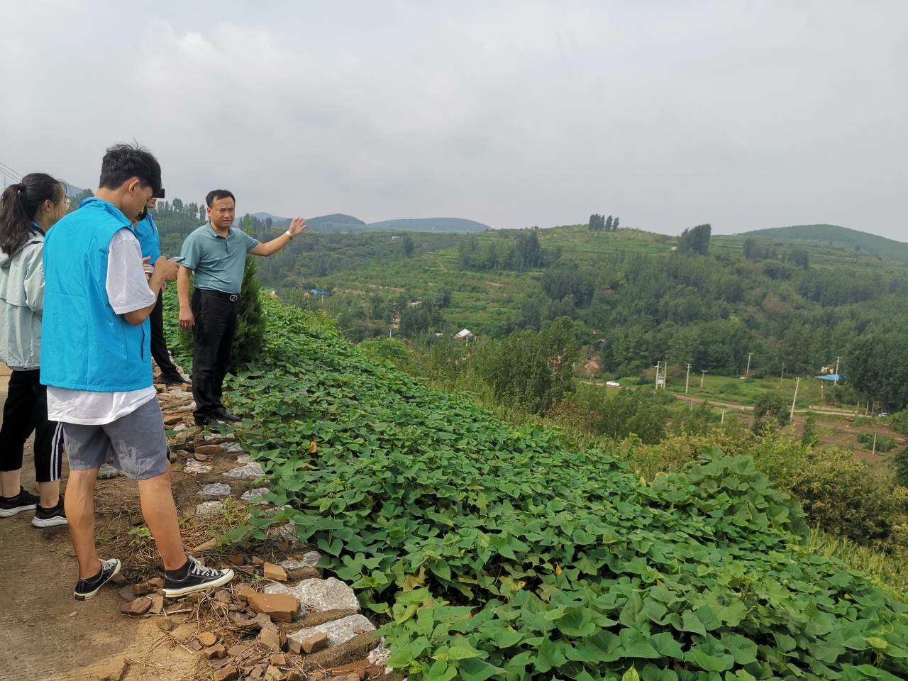 8月13日上午,队员们在365完美驻费县北天井汪村省派第一书记贺治成的带领下,沿山路前往北天井汪村进行调研活动。大家沿途一路查看一路询问,了解到目前全村现有村民336户,居民1024人,党员31名,现有耕地1310亩。大家来到涑河水库,贺治成书记告诉队员们水库建设从南到北延伸将近4公里,两岸的挡土墙高达五米,原本这条河流污水横流,杂草丛生,但是经过多年治理后,河水的质量有了显著提高,团队成员沿岸行走可以清晰的看到河底。与此同时,贺治成告诉队员们他为北天井汪村的发展构思了一个两年规划,概括为一村一河,两模式,三段四带,九推进,其中一村指的是北天井汪村,一河是对涑河的风景打造与两岸治理,两模式则是以涑河为分界东岸保留原本的老房子留下乡愁作为回忆,西岸进行现代化建设带动乡村发展,三段是贺治成书记为自己设定的工作时间段,四带是美丽乡村建设包括:康养敬老带、休闲娱乐带、特色种植示范带、民俗古居文化带。大家对村子的发展成果啧啧称赞,对更加美好的未来充满期待。