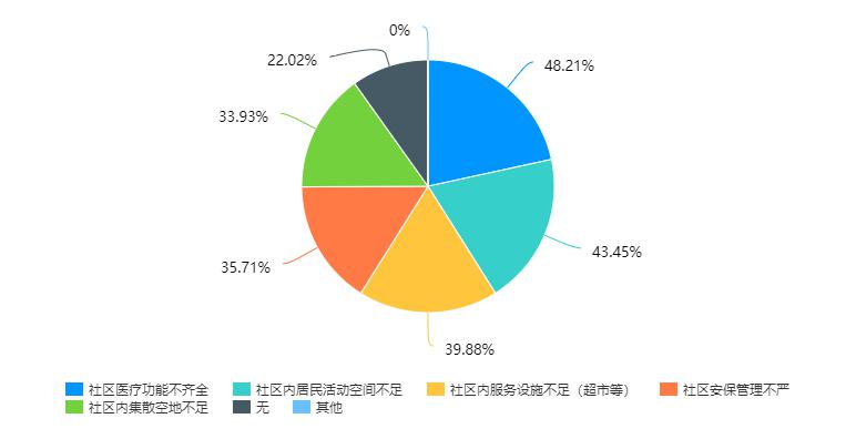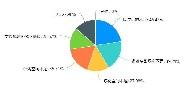 在居民对城市空间的需求的调查中,46.43%的居民反映城市医疗设施不足,39.29%的居民反映避难集散场所不足,同时在居民对社区空间管理上的建议的调查中,48.21%的居民反映社区医疗功能不齐全,43.45%的居民反映社区内居民活动空间不足,这与我们调研的方向和调研中发现的问题相吻合。