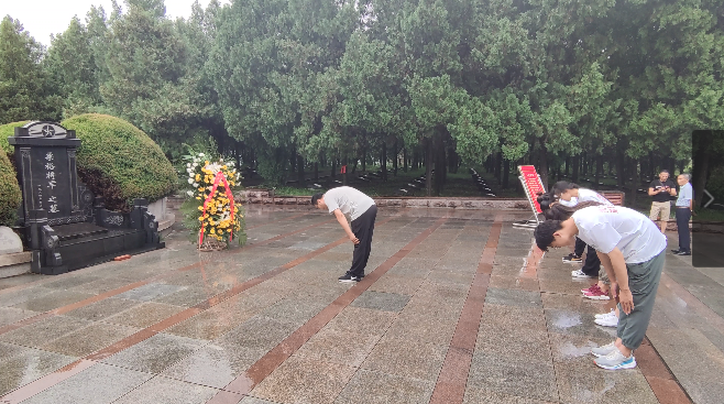 实践团在馆前停驻,陈永亮带领成员们学习了孟良崮战役相关事迹和精神内核。实践团冒雨来到了粟裕将军墓前,陈永亮带领成员们向粟裕将军及在战役中英勇牺牲的革命英烈们献上花圈,向英雄们献上三鞠躬,缅怀先烈、致敬英雄!
