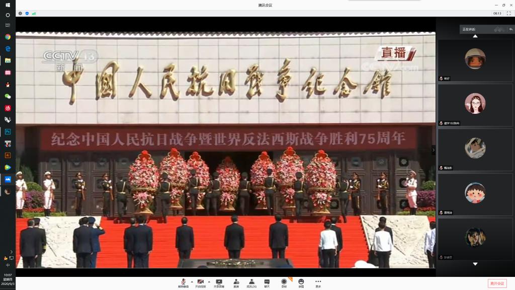 为深入推进社会主义核心价值体系,突出爱国教育主题,宣传抗日民族统一战线旗帜下全民抗战的历史功绩、中国人民抗日战争的历史意义和抗战精神,引导同学们深刻认识历史、纪念历史,9月3日上午,建筑与城乡规划学院建学182团支部组织全班同学在线上观看抗日战争暨反法西斯战争75周年直播。