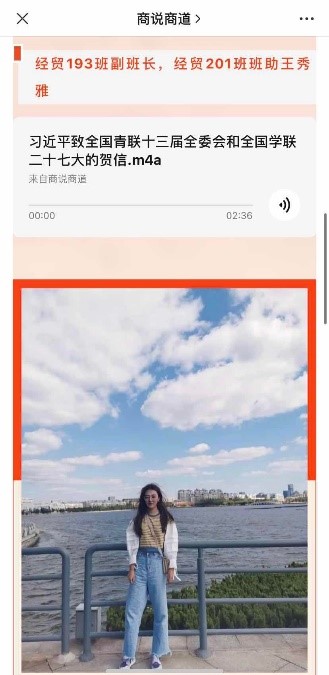 本次活动以商学院微信公众号商说商道为主要依托,采取视听结合的方式,将党建原著和重要讲话精神通过音频和文字的形式同步呈现。本次活动参与的人员除了商学院各学生党支部的学生党员外,还有低年级的学生骨干和入党积极分子。他们用铿锵有力的话语和掷地有声的腔调诠释着自己内心深处对党组织的向往和向党组织靠拢的决心,也向我们诠释着年轻一代的蓬勃朝气和理论学习热情。