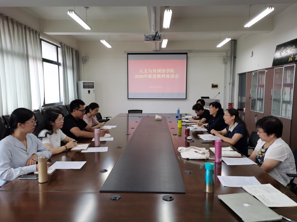 9月16日下午,人文与外国语学院在嘉陵江路校区教学楼A410会议室举行2020年新引进教师座谈会,党总支书记王新、院长巩湘红、副院长王晓东、郭印、莫玉梅、院长助理冯志国和新引进教师亲切交流。