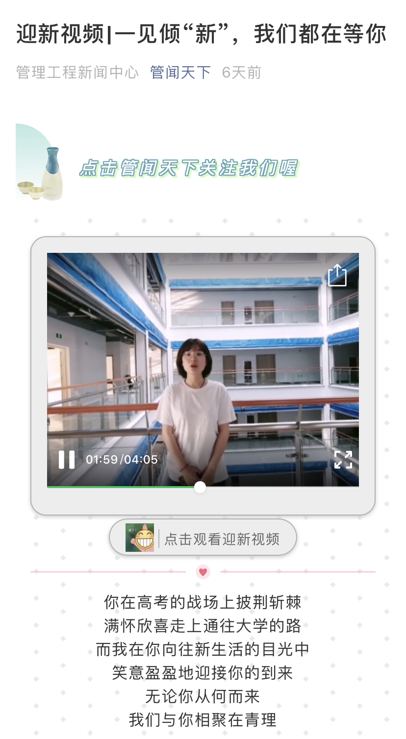 线上方面,针对今年家长不能进校实际情况,学院“管闻天下”微信公众号专门开辟迎新专版,共推出20期,涉及学院发展历史、教学科研、学生工作、报到流程、入学适应、校园环境等方面。在新生报到前,让新生关注“管闻天下”微信公众号,家长和学生每天都可以看到推送的文章,认真学习,全面了解,及早准备,明确方向,为今后学习生活奠定坚实基础。同时建立了QQ群、易班新生专区等,班主任、班助全部加入到群里面,随时解答学生提出的各类问题,让学生明明白白、开开心心来校报到学习。