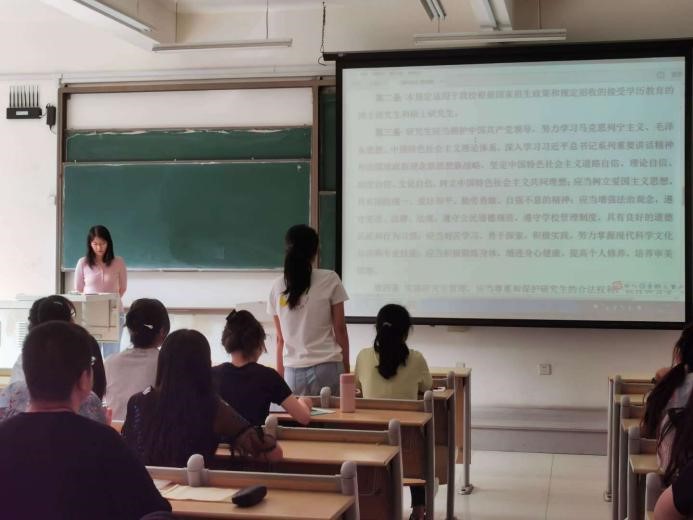 接下来,冯宁带领全体新生一起学习了《365完美体育研究生管理条例》。她指出,当代研究生应合理使用自己的权利,履行应尽的义务,贯彻诚信教育、遵守校规校纪、积极参与各类专业性比赛和创新创业大赛,在钻研学术的同时加强自身思想道德修养,做一名合格的研究生。