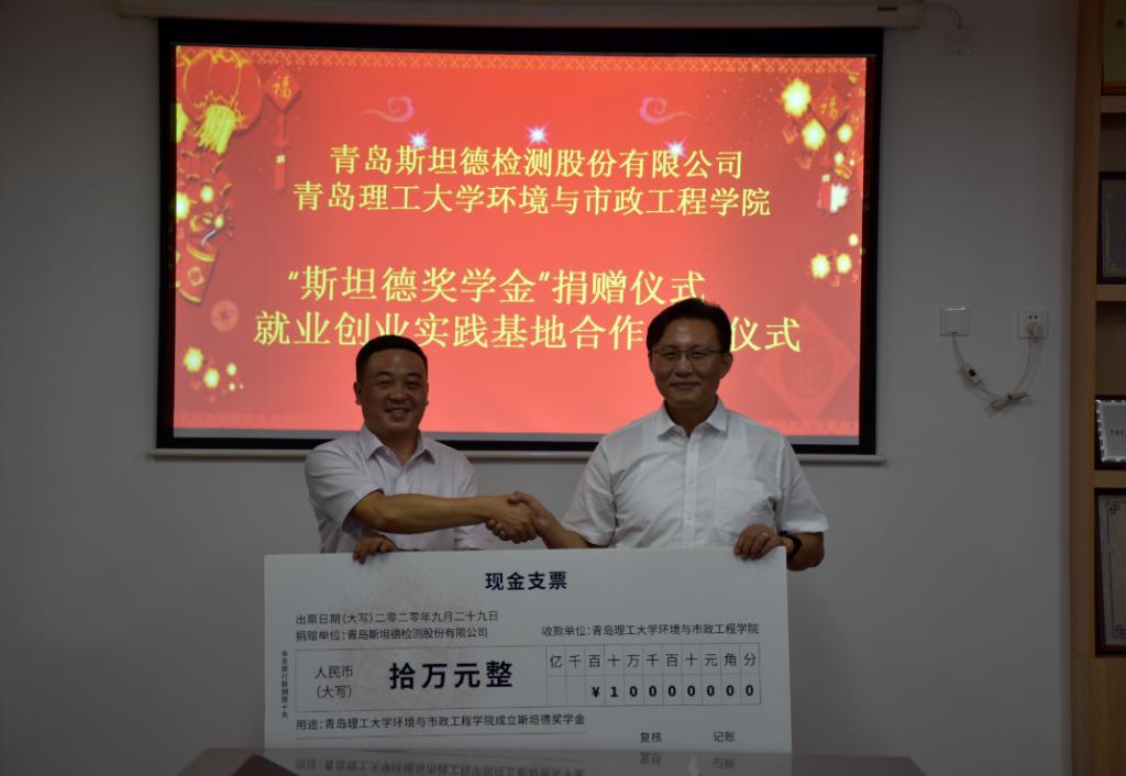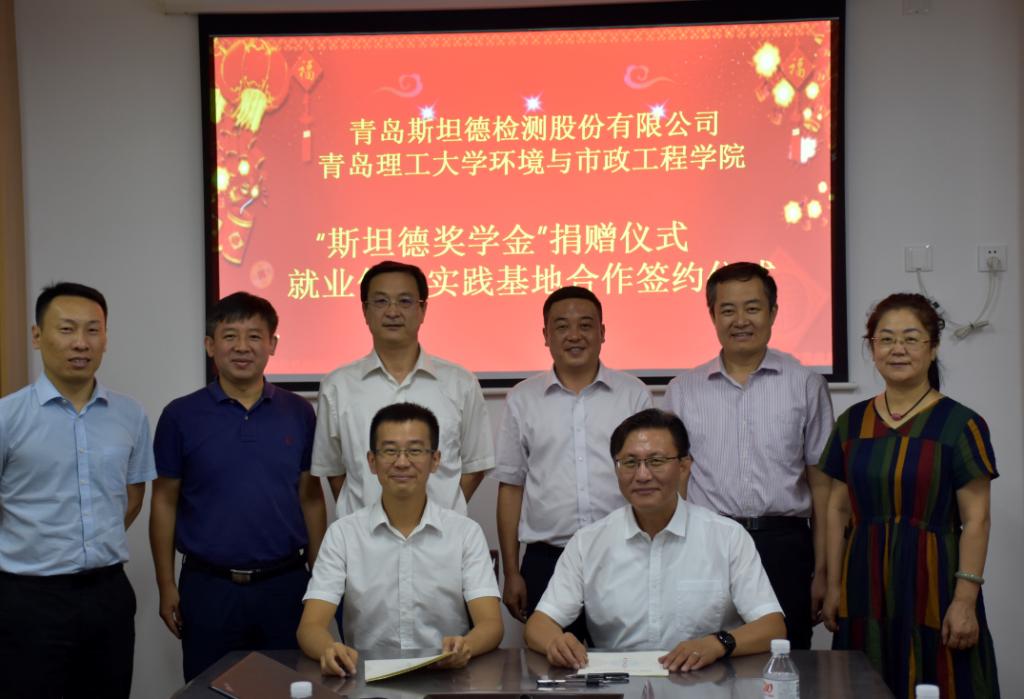 9月29日上午,环境与市政工程学院与青岛斯坦德检测股份有限公司在一教214会议室举行“斯坦德奖学金”捐赠和就业创业实践基地签约仪式。青岛斯坦德检测股份有限公司常务副总裁张威、副总裁李栋、生态环境事业群总经理陈海滨、综合中心总监梁佳,学校合作发展处副处长张国昌,环境与市政工程学院领导班子相关成员参加仪式。仪式由环境与市政工程学院长毕学军主持。