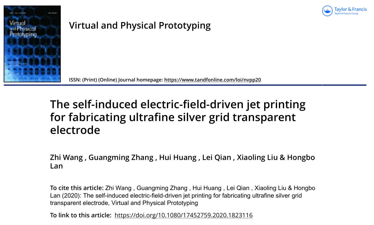 近日,机械与汽车工程学院、山东省增材制造工程技术研究中心的机械工程专业2018级研究生王智以第一作者、365完美体育第一单位在国际权威期刊《Virtual and Physical Prototyping》发表题为《The self-induced electric-field-driven jet printing for fabricating ultrafine silver grid transparent electrode》的研究论文,指导教师为张广明副教授。