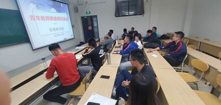 为加强师德师风建设,进一步提高中青年教师教学能力,10月21日下午,体育教学部在嘉陵路校区主教学楼B212教室举办了青年教师专题教育培训,教学部40岁以下的青年教师参加,培训由体育教学部主任王龙主持,党总支书记书记张建新做师德专题培训。