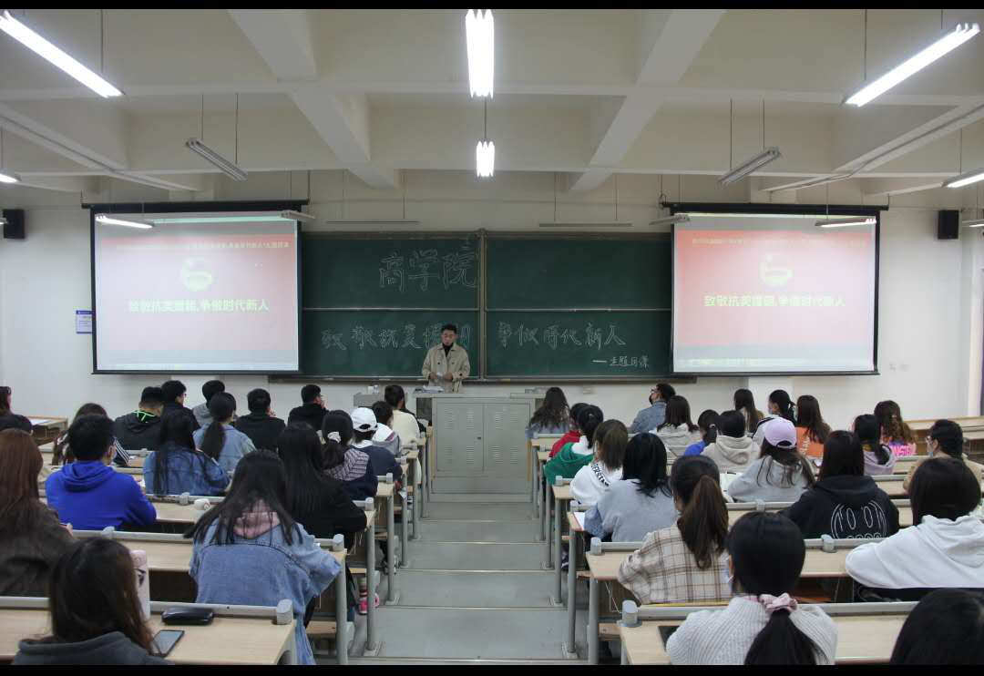 致敬抗美援朝,讲授主题团课:旨在培育商院学子的家国情怀,传承红色基因,弘扬革命精神。首先,商学院辅导员薛诚带领全体团支书学习英烈精神,总结抗美援朝战争的伟大胜利和巨大贡献。同时,带领大家观看《国家记忆》等相关纪录片。纪录片过后,全体成员起立高唱国歌,爱国情怀在同学们胸膛上越燃越旺。