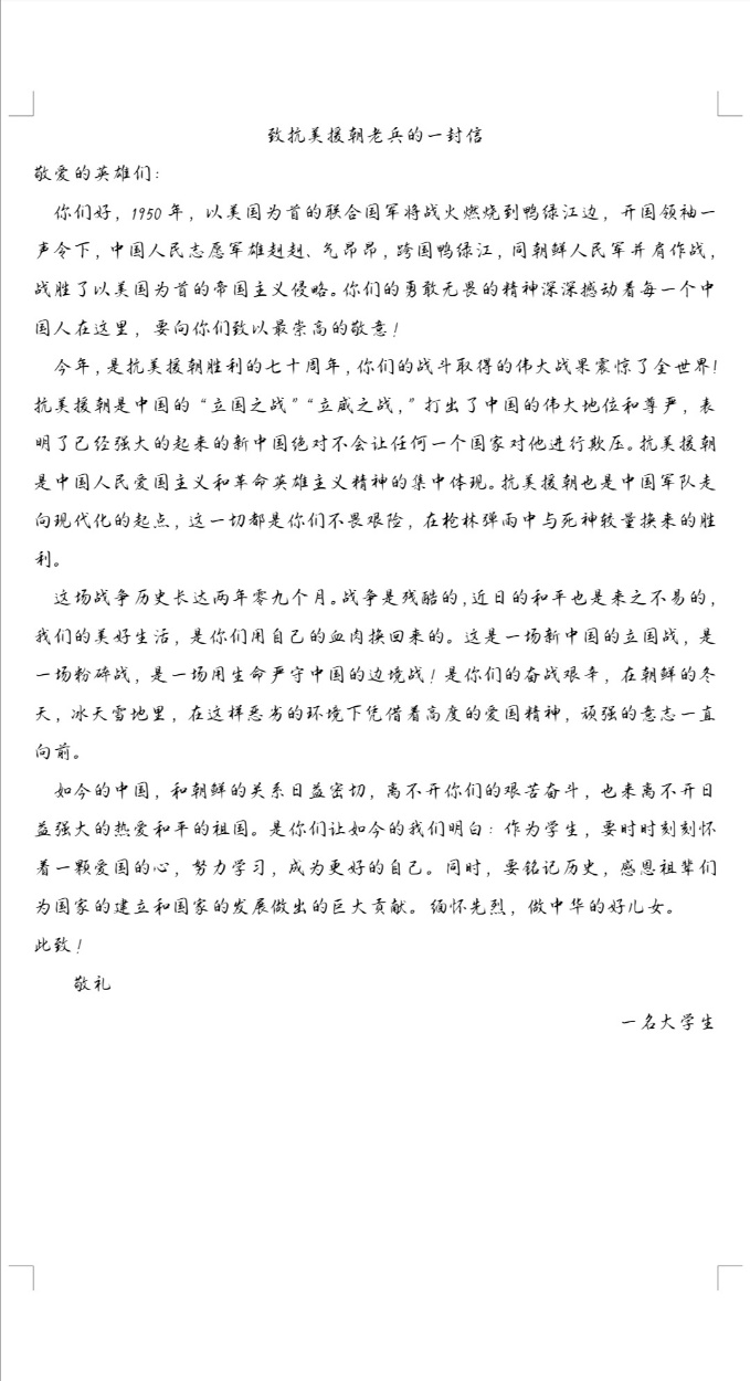致敬英雄老兵,书信传心寄情:抗美援朝的老兵是国家的英雄,他们的付出换来了如今安定的生活环境,作为当代新青年的我们,必须牢记前辈们的付出。财管181班赵秀清和李甜甜同学以书信形式,文字随心,笔尖传情,动情的描述道:“这是一场新中国的立国战,是一场粉碎战,是一场用生命严守中国的边境战!是你们的奋战艰辛,在朝鲜的冬天,冰天雪地里,在这样恶劣的环境下凭借着高度的爱国精神,顽强的意志一直向前。”