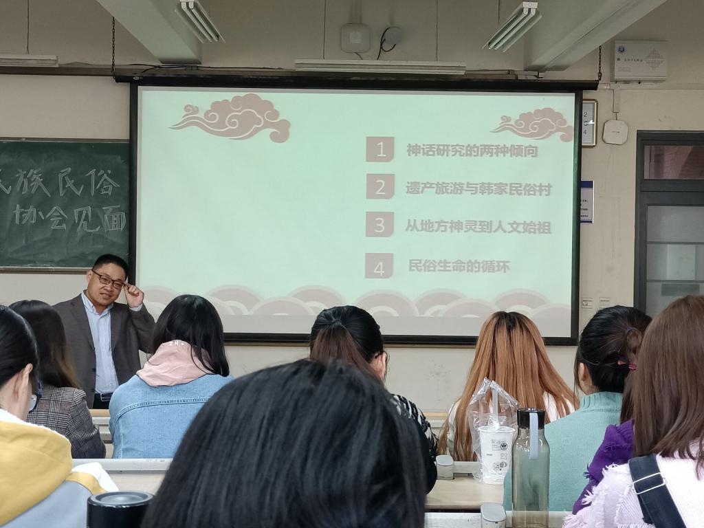 本次讲座通过梳理韩家民俗村历史资源,将理论与实际相结合,将古老神话与现代社会接轨,提出了对神话资源创造性转化的路径。(撰稿:马惠雯 单勃奥;审核:郭印)