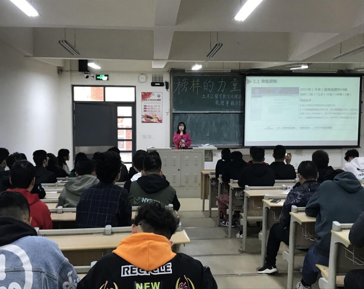 为进一步推进学风建设,营造良好的育人环境,用榜样的力量激励和引领学院广大学生,形成比学赶超的良好学习氛围,11月8日,土木工程学院“榜样的力量”先优学子事迹分享会在嘉陵江校区主教B202举办,国家奖学金获得者土木188刘甜,保研至东南大学、省政府奖学金获得者土木1712张贝贝,保研至华南理工大学材科172班马小惠为同学们做事迹分享,2020级学生参加活动。