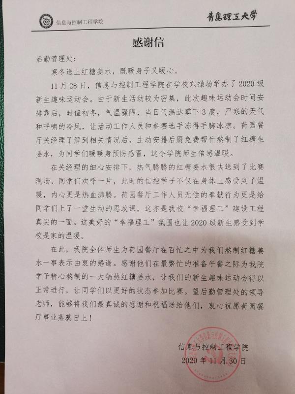 热气腾腾的红糖姜水很快送到了比赛现场,同学们欢呼一片,此时的信控学子不仅在身体上感受到了温暖,内心更是热血沸腾。为了表达对荷园餐厅工作人员的感激,11月30日下午,新生辅导员与学生代表为后勤管理处送去了感谢信,感谢荷园餐厅在最繁忙的准备午餐之际为学院学子精心熬制的一大锅热红糖姜水,让我们的新生趣味运动会得以正常进行,让同学们以更好的状态参加比赛。