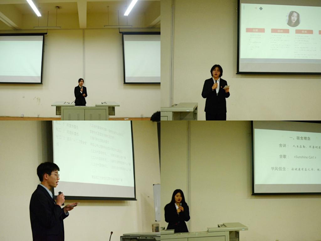答辩正式开始,由经过宿舍申报与学院推荐的10个优秀宿舍依次进行答辩。答辩现场,各宿舍代表通过PPT形式,围绕学习成绩、科创成果、综合素质、突出事迹等方面,进行了现场答辩,充分展示了各宿舍笃学、文明、创新的舍风,由评委进行现场打分。经过评选,B6#710、B1#305宿舍荣获“先优文明宿舍”称号,B6#610、B6#609宿舍荣获“先优学风宿舍”称号。