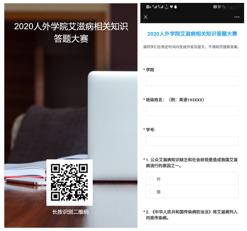 为进一步在学生中普及预防艾滋病的知识,提高防御艾滋病的能力。12月2日,学院面向全院学子,推出艾滋病知识答题竞赛活动。活动采取线上答题形式,通过问卷星发布了有关预防艾滋病题目,最终会根据同学们答题情况评定奖项和颁发奖品。