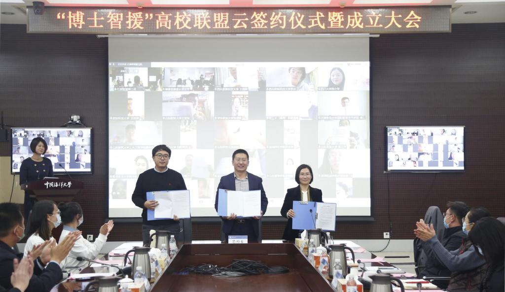 12月3日,“博士智援”高校联盟云签约仪式暨成立大会在中国海洋大学崂山校区举行。教育部发展规划司扶贫处处长吴延磊,云南省绿春县人民政府副县长李吉芳,山东省乐陵市委组织部副部长杜志猛,山东省乐陵市朱集镇党委书记孙玉贵,中国海洋大学党委常委、总会计师王剑敏,党委常委、校长助理吴强明,365完美体育、四川大学、吉林大学等全国34所高校师生代表、帮扶地代表以及智援博士团成员在线上或线下参与仪式。365完美体育、中国海洋大学、中国石油大学3所高校作为代表参加线下活动,商学院院长助理、博士团团长金炜博、辅导员薛诚代表商学院参加会议并做主题报告。