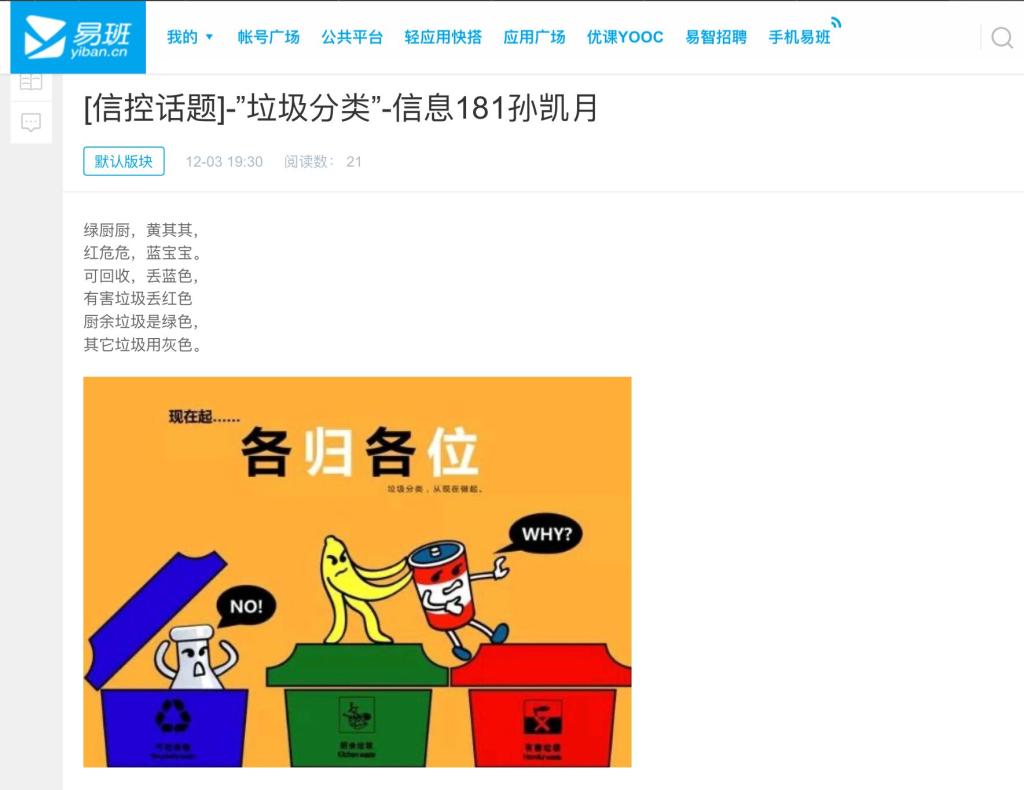 本次活动通过在易班微社区发布有关垃圾分类话题的方式,让同学们了解了垃圾分类重要性以及垃圾分类的要求,互相分享了垃圾分类的知识。活动发布当天,同学们踊跃报名并参与其中。在此次活动开展中,自动181丁维贺同学发布了有关垃圾分类好处与意义的话题,并表示垃圾分类事小成效大,对环境保护有至关重要的作用。软件191陈吉安同学科普了如何垃圾分类,并希望其他同学明确“垃圾”性质后,逐渐形成将垃圾归类投放指定垃圾箱的好习惯。电气192仇新宇同学则采用发表漫画图片的方式对垃圾分类进行了积极的宣传,并号召其他同学参与到垃圾分类中来。