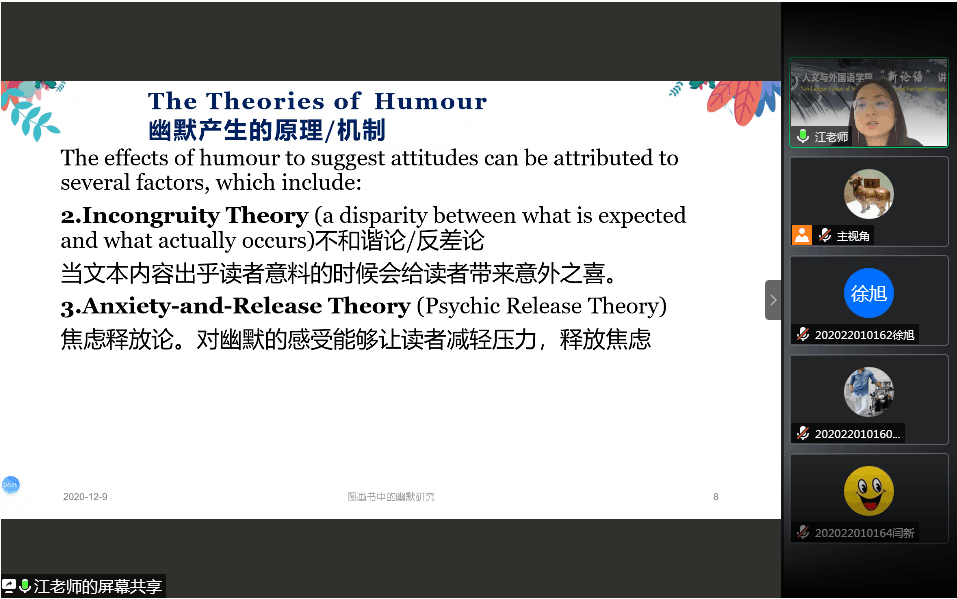 12月9日,人文与外国语学院“新论语讲坛”科研讲座第98讲进行。本次讲座采用线上形式,由大学外语教研室江建利副教授主讲,主题为“图画书中的幽默研究”。