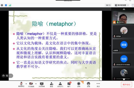 12月9日,人文与外国语学院“新论语”讲坛第99讲进行。本次讲座以腾讯会议为平台采用线上形式举行,由大学外语教研室张恒权副教授主讲,题为“浅析英汉诗词中隐喻的文化异同”。