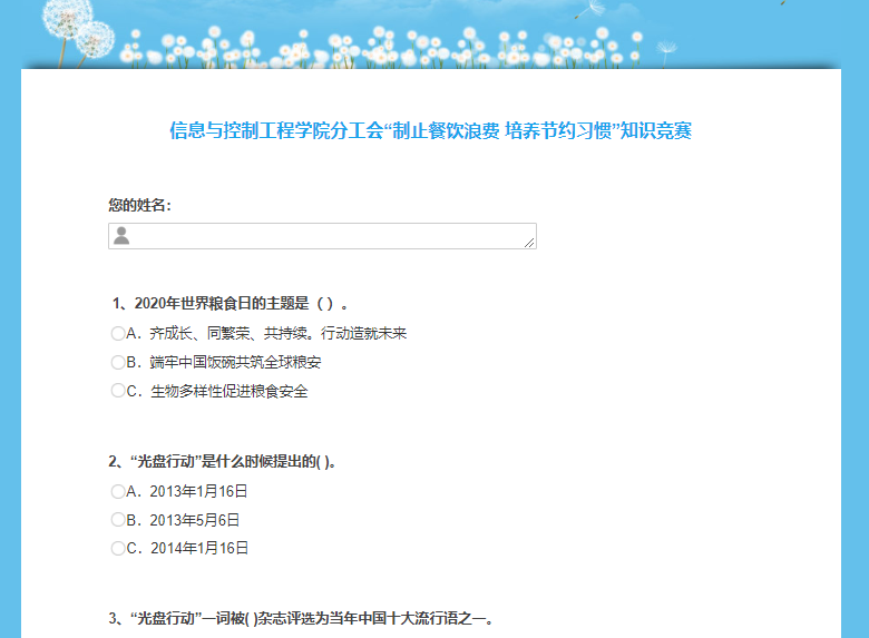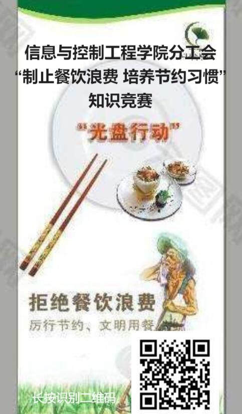 根据《365完美体育“制止餐饮浪费 培养节约习惯”行动方案》的通知要求,12月14日至16日,信息与控制工程学院分工会开展“制止餐饮浪费 培养节约习惯”线上知识竞赛活动,近120名教职工参加了此次活动,该活动得到了校工会的大力支持。