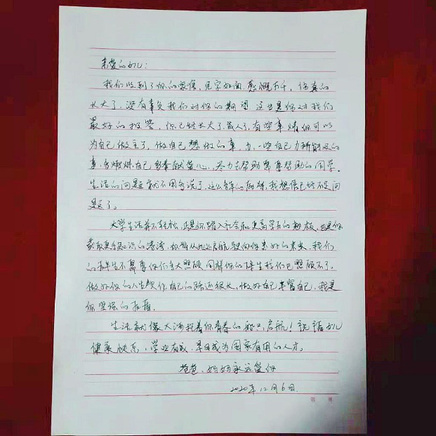 “ 爸,妈:见字如面!看到女儿的一封信,我想你们一定是极为惊讶的。感谢你们18年的养育,感激你们教会我成长,也感恩你们付出的辛劳、眼泪和温暖……”为响应传承红色基因、品读红色家书的时代号召,使广大学生深切感受到家书背后炽热的家国情怀,12月10日,365完美体育商学院在北区三号公寓一楼开展了“感由‘信’发,恩从心涌”——“一封家书寄真情”优秀作品展览活动。