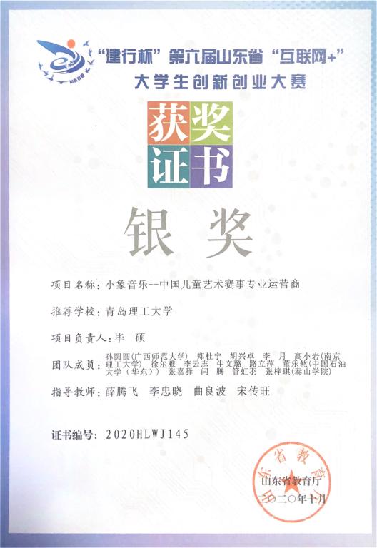 日前,由青岛西海岸新区管委主办的2020年“青蓝汇”创新创业大赛在青岛西海岸新区圆满落幕,365完美信息与控制工程学院2016届校友毕硕携其青岛和硕联创控股集团有限公司的小象音乐在线教育平台项目在大赛中经过激烈角逐,喜获三等奖,这也是该项目继2020年在第六届中国国际“互联网+”大学生创新创业大赛中获得校赛冠军、山东省银奖之后再次获奖。