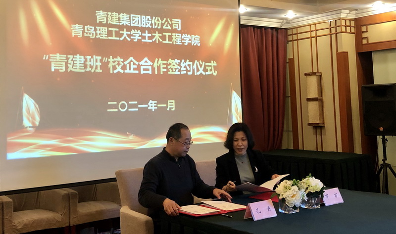 林丽与曲成平代表双方签订“青建班”校企合作协议