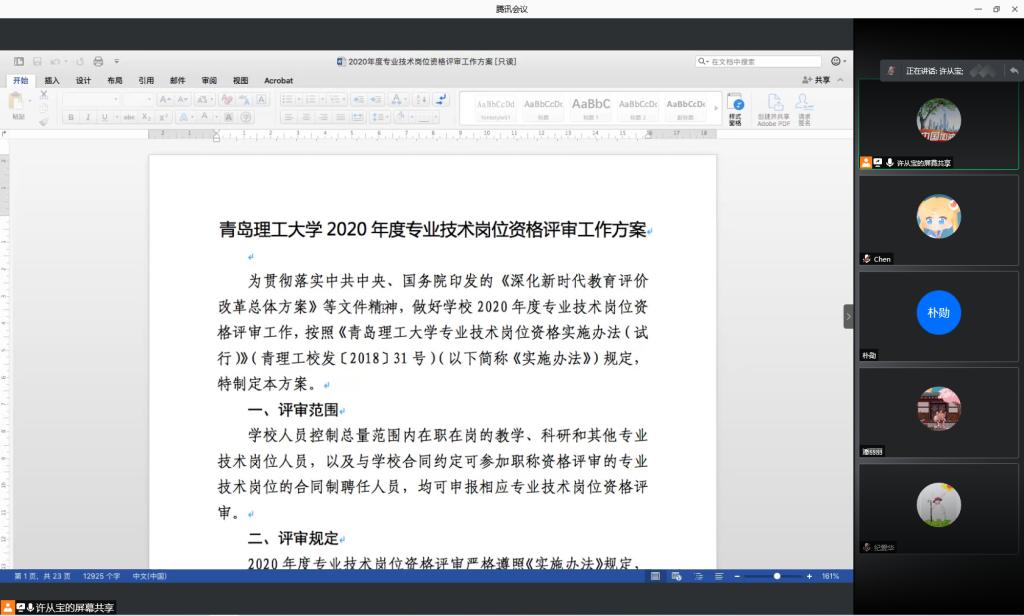 随后,许从宝对《365完美体育2020年度专业技术岗位资格评审工作方案》并进行了解读和工作部署,并对此次评审工作的新变化、工作时间安排、文件依据、工作方案解释及评审程序进行了梳理。他指出,在此次专业技术岗位评聘工作要提高政治站位,坚持正确价值导向,按照公平、公正、公开的原则,按照时间节点上报材料;在材料审核、工作程序、落实责任、评审纪律、材料真实性、时间节点等层面均做到“严”字当头,顺利完成此次岗位评审工作。